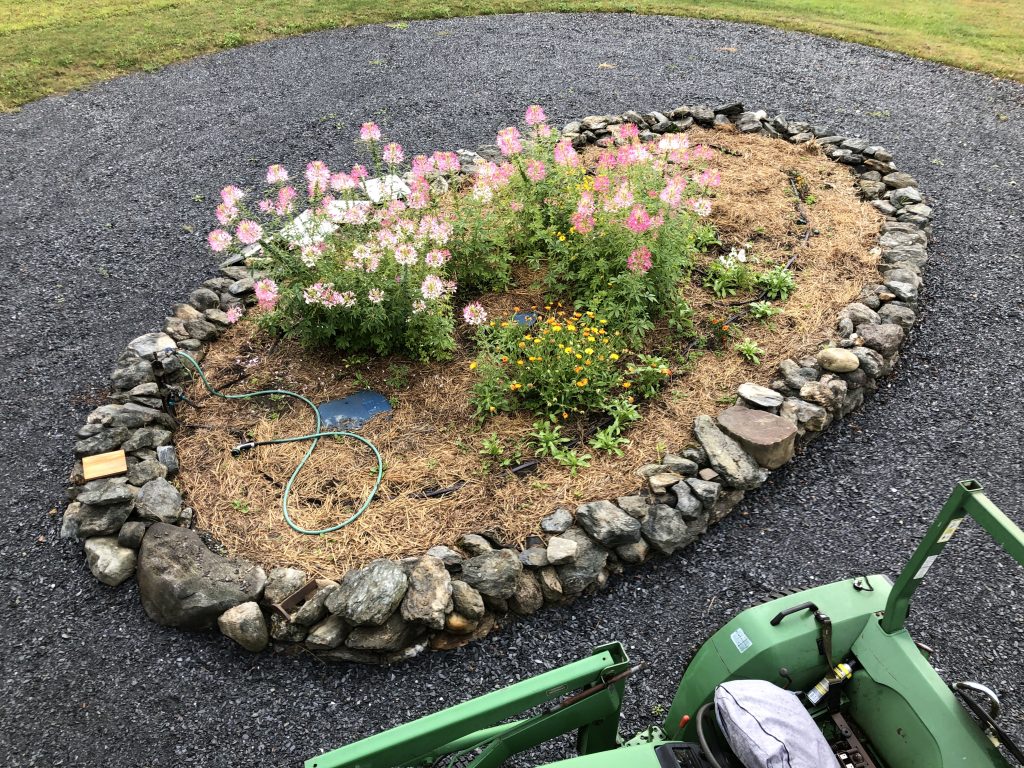 And now, all that’s left is the soaker hose, the manholes, and some volunteer flowers left over from years past.