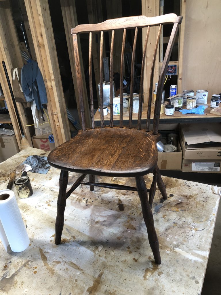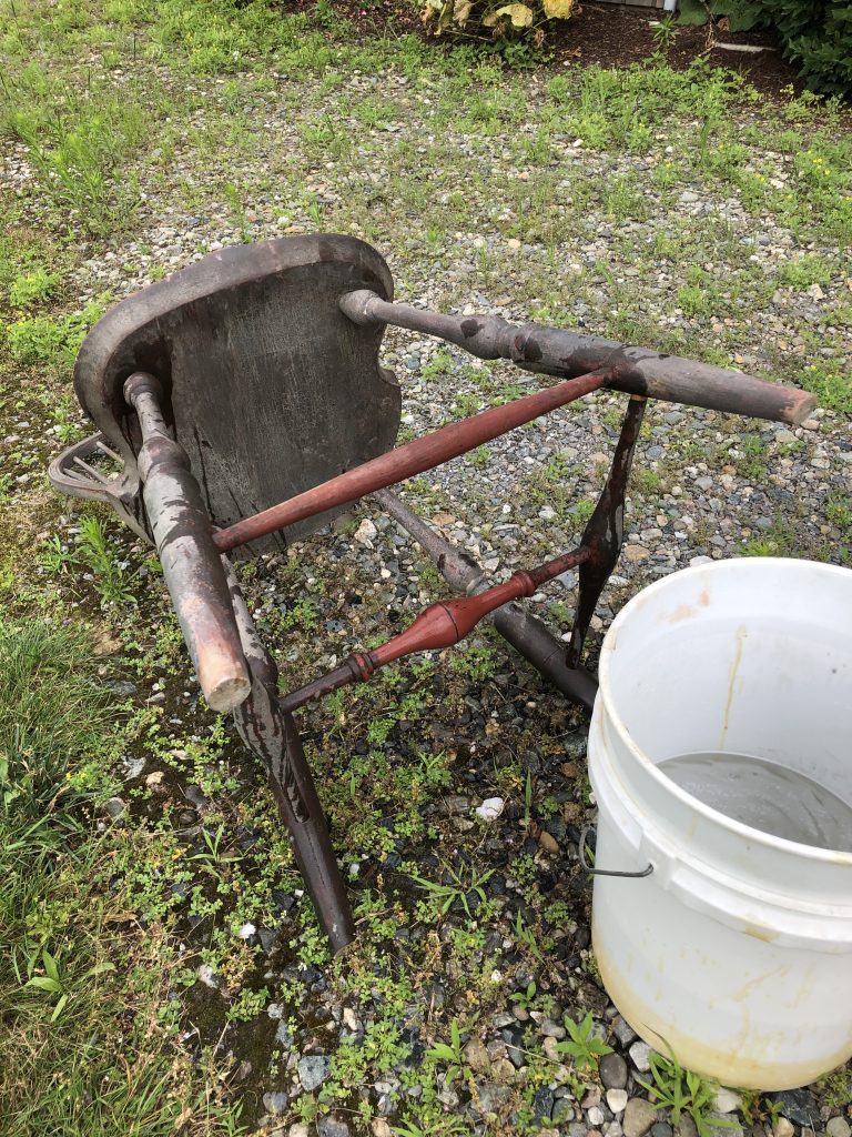 I was rooting around in the storage unit, where I keep the ‘cream of the crap’ that came with the Stowe house. I’ve got about a dozen sad looking wooden chairs in there, and one of them caught my eye.